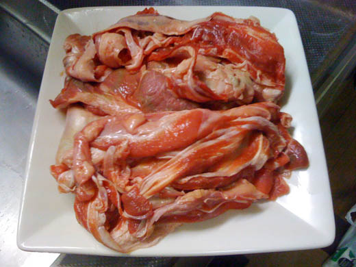 あ、グロ画像じゃないですよ 皿一杯の牛スジ肉ザマス 今からコイツをドロドロになるまで煮込む作業を開始